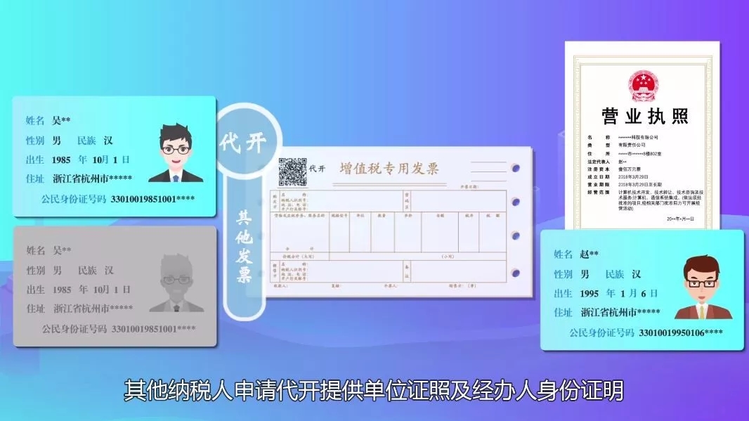 其他納稅人申請代開發票,提交加載統一社會信用代碼的營業執照(或稅務登記證或組織機構代碼證)、經辦人身份證件及復印件。
