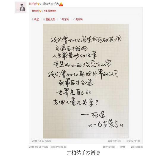 2015年5月25日凌晨,105歲高齡的楊絳先生離世。署名為楊絳的《一百歲感言》的手寫體“世界是自己的,與他人毫無關系”等相關內容,在網上、朋友圈被火速轉載開來。其實,這段話內容和字體均非楊絳先生所做,手寫體出自井柏然的“手抄微博”系列之一。