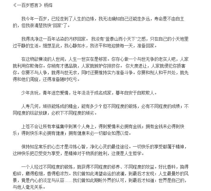 楊絳一百歲感言全文 楊絳一百歲感言是真還是假?