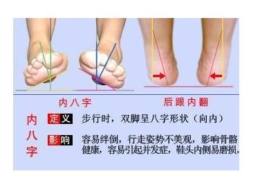 內八字是走路時腳尖向內,右腳向左偏,左腳向右偏交替前進,造成不良的走路習慣。