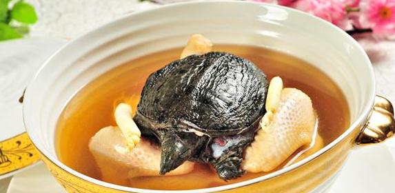 第四步:燒熱油鍋,加入花椒稍炸,倒入砂鈉內,蓋上蓋,用小火煨l小時后,端下砂鍋,揭開蓋,取出肘子肉,輕輕端出鍋墊,把雞肉、鱉裙翻扣在大湯碟內