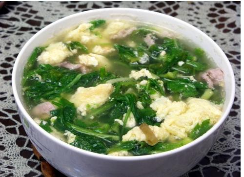 (2)炒鍋上旺火,放水加蓋燒沸,放入植物油,接著放入薺菜,再煮沸,倒入雞蛋稍煮片刻,加入精鹽,味精,盛入大湯碗內即成。