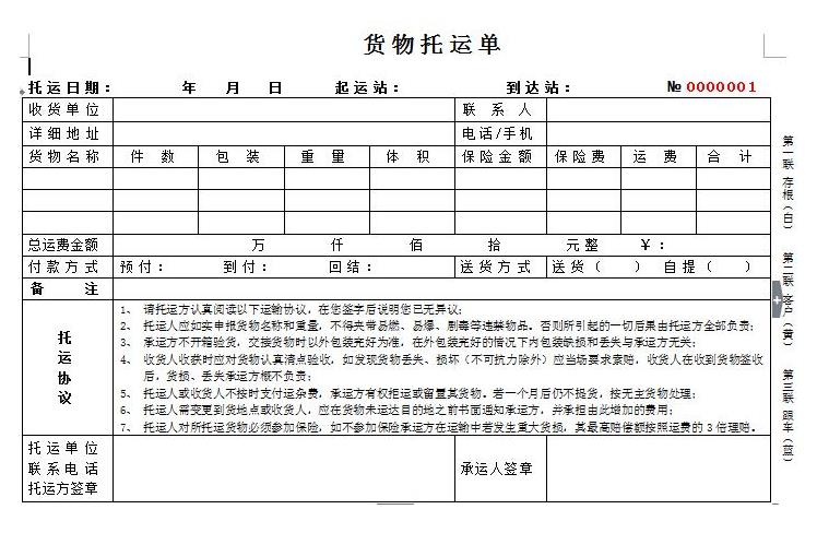 托運單是運貨人和托運人之間對托運貨物的合約,其記載有關托運人與送貨人相互間的權利義務。運送人簽收后,一份給托運人當收據,貨物的責任從托運轉至運送人,直到收貨人收到貨物為止。如發生托運人向運送業要求索賠時,托運單位必備的文件。運送業輸入托運單上數據的正確與否,影響后續作業甚大。