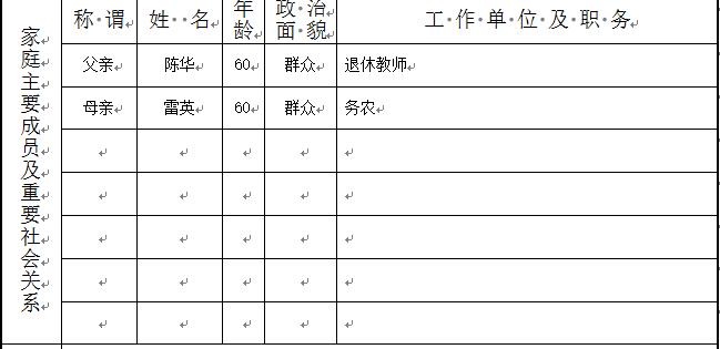稱謂、姓名、年齡、政治面貌、工作單位及職務要填寫準確。稱謂的寫法要規范:配偶為妻子、丈夫,子女為兒子、女兒,多子女為長子、次子、三子、長女、次女、三女等,父母為父親、母親。