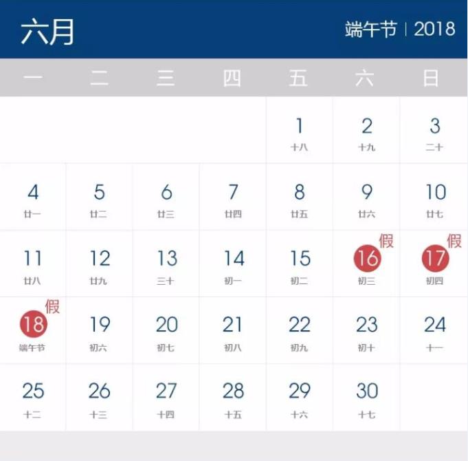 根據(jù)國(guó)務(wù)院發(fā)布的2018年部分節(jié)假日安排通知, 2018年端午節(jié)具體放假時(shí)間為:2018年6月18日(星期一)放假,與周末(6月16日、6月17日)連休。