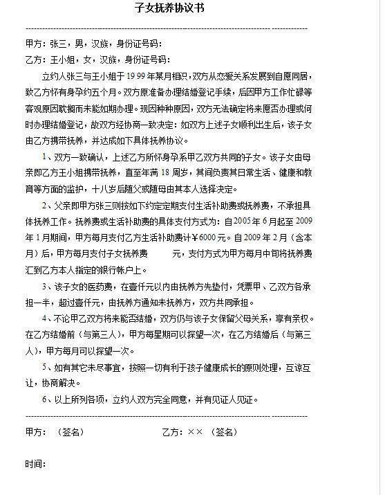 非婚生子女撫養(yǎng)協(xié)議適用于沒有辦理結(jié)婚登記而生育子女的男女雙方,就子女撫養(yǎng)問題簽訂協(xié)議。