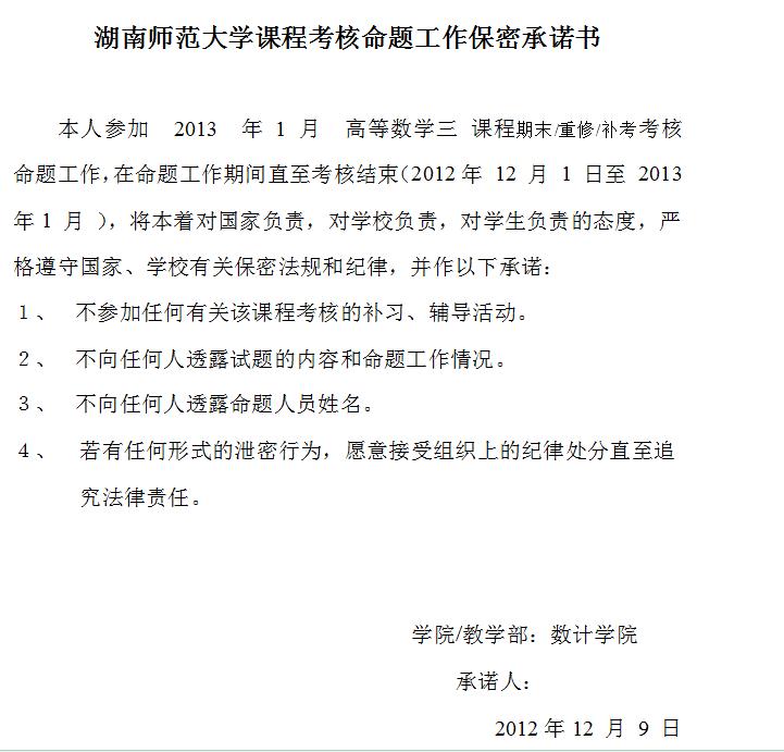 為做好研究生招生入學考試試題的保密工作,提高試題命制質量,保證學校研究生招生工作安全、平穩地運行,根據教育部辦公廳有關通知精神,研究生招生入學考試試題命題小組的每一位成員必須簽訂如下保密承諾。