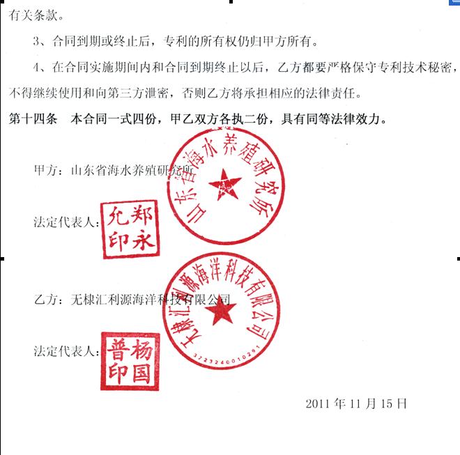 無棣匯利源海洋科技有限公司(以下簡稱乙方)屬于高科技海水養殖領域的企業,擁有相應的廠房、設備。人員及其他條件,希望獲得許可實施該專利技術。