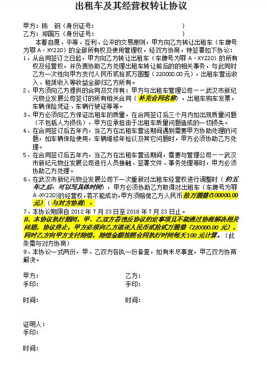 5、在本協議有效期內,由乙方負擔所有維修費用。車輛行駛滿5000公里,乙方必須同甲方共同監督下換發動機油、三濾,齒輪油每滿10000公里時換。【1】【2】 出租車轉讓協議范本