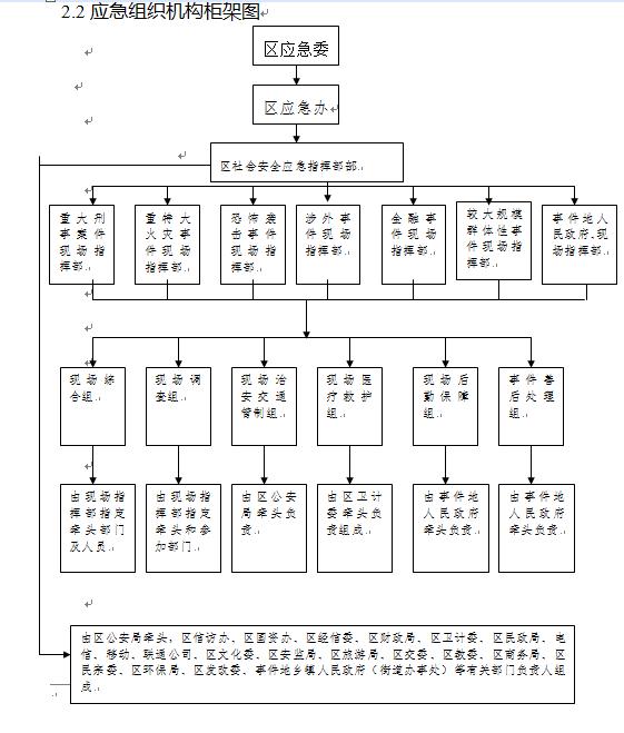 2.1.1按照“精簡(jiǎn)、統(tǒng)一、高效”的原則,xx區(qū)人民政府突發(fā)公共事件應(yīng)急委員會(huì)(以下簡(jiǎn)稱區(qū)應(yīng)急委,其辦公室簡(jiǎn)稱區(qū)應(yīng)急辦)的領(lǐng)導(dǎo)下,設(shè)立xx區(qū)社會(huì)安全事件應(yīng)急指揮部(以下簡(jiǎn)稱區(qū)社會(huì)安全應(yīng)急指揮部),作為本區(qū)處置突發(fā)社會(huì)安全事件的組織指揮機(jī)構(gòu),統(tǒng)一指揮協(xié)調(diào)全區(qū)突發(fā)社會(huì)安全事件應(yīng)急處置工作。
