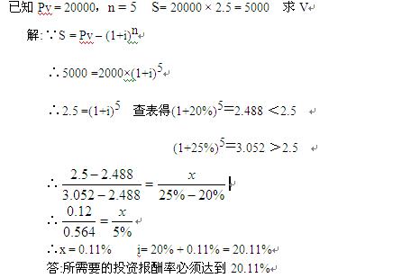 (P/F,i,5)=2,通過查表,(P/F,15%,5)=2.0114,(F/P,14%,5)=1.9254,運用查值法計算,(2.0114-1.9254)/(15%-14%)=(2-1.9254)/(i-14%),i=14.87%,報酬率需要14.87%。