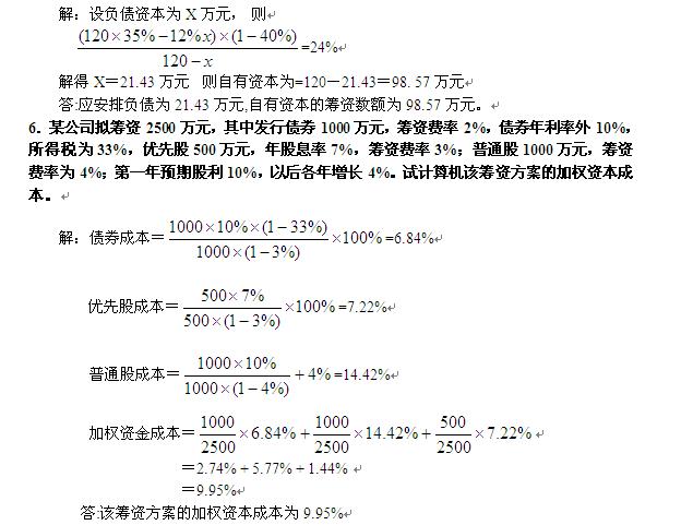 5.某企業有一投資項目,預計報酬率為35%,目前銀行借款利率為12%,所得稅率為40%,該項目須投資120萬元。請問:如該企業欲保持自有資本利潤率24%的目標,應如何安排負債與自有資本的籌資數額。