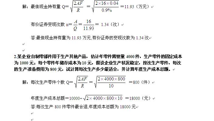 1.江南股份有限公司預計下月現金需要總量為16萬元,有價證券每次變現的交易費用為0.04萬元,有價證券月報酬率為0.9%。要求:計算機最佳現金斥有量和有價證券的變現次數。