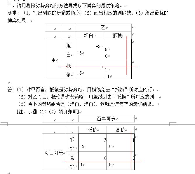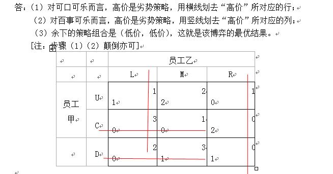 答:(1)對可口可樂而言,高價是劣勢策略,用橫線劃去“高價”所對應(yīng)的行;