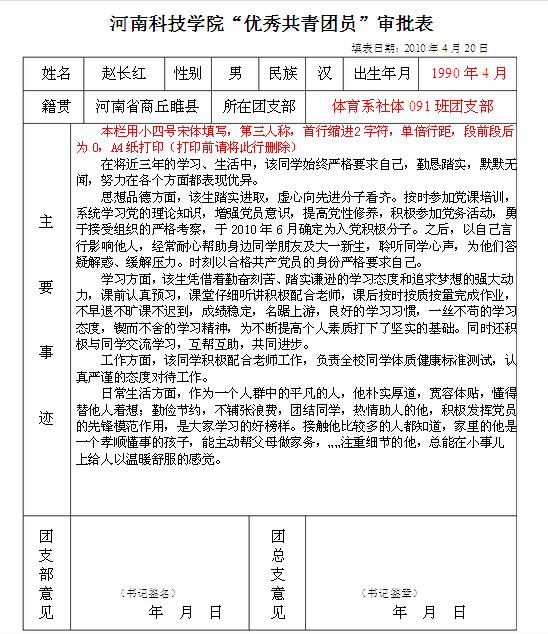 說明:優秀團員事跡材料另附紙張,附于本表之后。事跡材料須用寫實手法,字數在1000字左右。事跡材料用A4紙打印,上下左右的頁面邊距均為 |