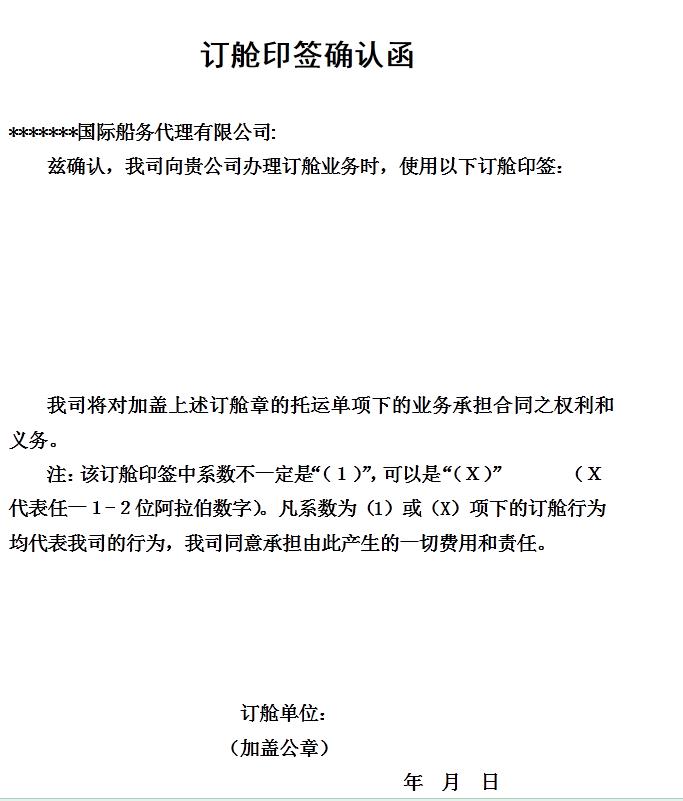 注:該訂艙印鑒中系數不一定是“(1)”,可以是“(x)”(x代表任一1-2位阿拉伯數字)。凡系數為(1)或(x)項下的訂艙行為均代表我司的行為,我司同意承擔由此產生的一切費用和責任。