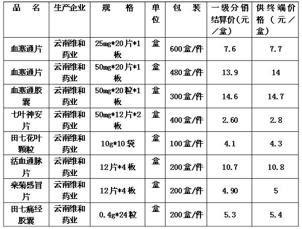 因三七原料持續(xù)暴漲,且原料貨源緊張,為保證我公司及各合作客戶的正常經(jīng)營,現(xiàn)對我公司產(chǎn)品二級商業(yè)分銷結(jié)算價(jià)格及出貨銷售價(jià)格體系調(diào)整如下: