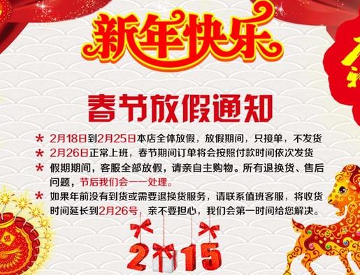 恒廣集團2015年春節放假安排如下:恒廣北京公司的放假時間為2月18日至2月24日,恒廣研究總部、信息總部的放假時間為2月18日至2月24日,2月25日正常上班;恒廣上海、深圳、成都、杭州、重慶公司放假時間為2月18日至2月25日。春節后所有產品將從2月25日晚上恢復發送。春節期間的重要信息,將在節后產品中提供給客戶。祝大家新年幸福,事業興旺,羊年大吉!