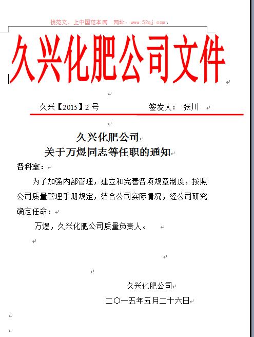 為了加強內部管理,建立和完善各項規章制度,按照公司質量管理手冊規定,結合公司實際情況,經公司研究確定任命: