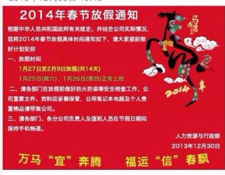 2014年1月29日-2月5日放假八天,2014年1月26日、2月8日、2月15日照常上班。各部門請安排好工作進度,根據業務進展情況可自行安排加班。