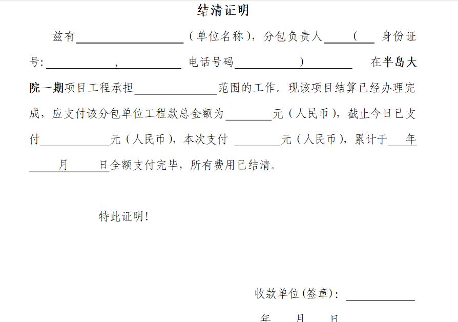 ___________________工程,已取得石家莊市建設(shè)工程竣工備案表。 __________________公司(建設(shè)單位)已按合同約定結(jié)清__________________公司(施工企業(yè))工程款,不存在拖欠問題,如該工程再出現(xiàn)因農(nóng)民工工資拖欠問題導(dǎo)致的上訪事件,屬于惡意討薪,我公司承擔(dān)全部法律責(zé)任。