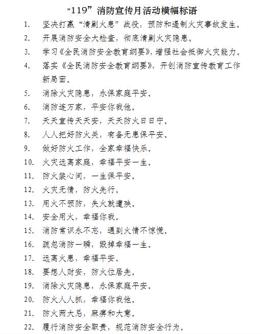 以下是為您推薦的《"119”消防安全宣傳標語大全》,希望能對您的工作、學習、生活有幫助,歡迎閱讀參考!