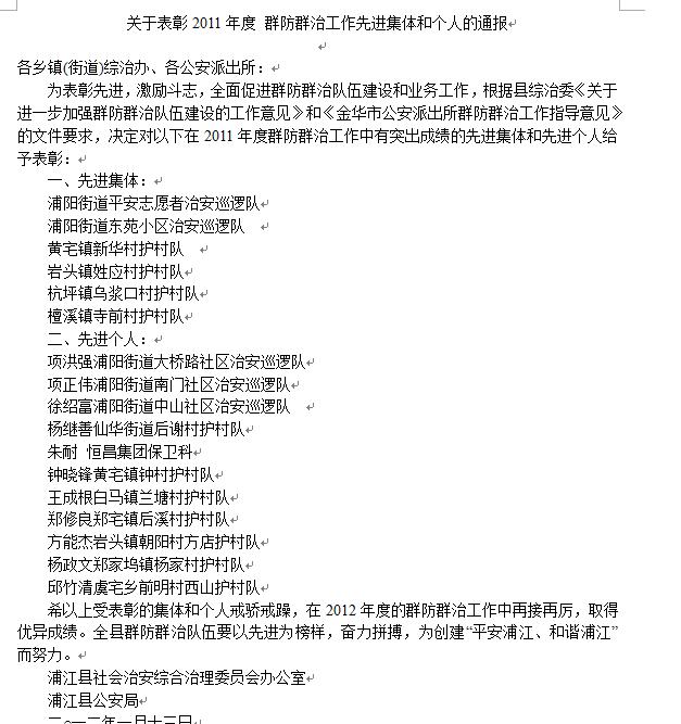 為表彰先進,激勵斗志,全面促進群防群治隊伍建設和業務工作,根據縣綜治委《關于進一步加強群防群治隊伍建設的工作意見》和《金華市公安派出所群防群治工作指導意見》的文件要求,決定對以下在2011年度群防群治工作中有突出成績的先進集體和先進個人給予表彰: