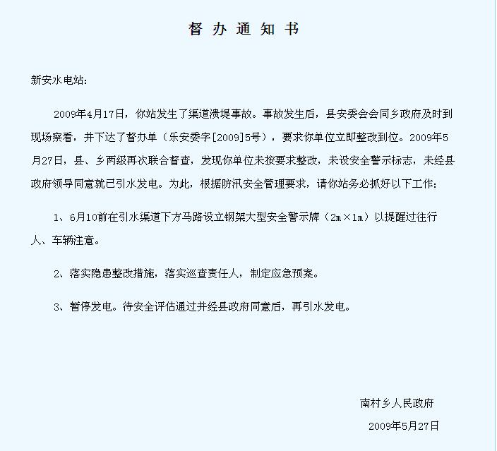 2009年4月17日,你站發(fā)生了渠道潰堤事故。事故發(fā)生后,縣安委會會同鄉(xiāng)政府及時到現(xiàn)場察看,并下達(dá)了督辦單(樂安委字[2009]5號),要求你單位立即整改到位。2009年5月27日,縣、鄉(xiāng)兩級再次聯(lián)合督查,發(fā)現(xiàn)你單位未按要求整改,未設(shè)安全警示標(biāo)志,未經(jīng)縣政府領(lǐng)導(dǎo)同意就已引水發(fā)電。為此,根據(jù)防汛安全管理要求,請你站務(wù)必抓好以下工作: