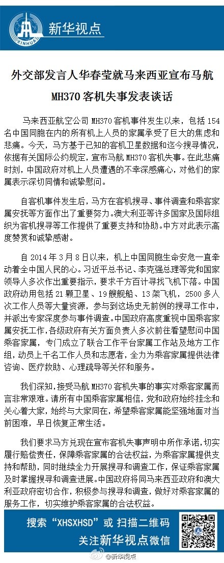 外交部發(fā)言人華春瑩就馬來(lái)西亞宣布馬航MH370客機(jī)失事發(fā)表談話