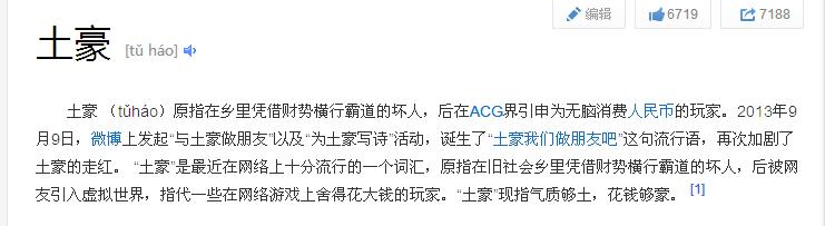 土豪 (tǔháo)原指在鄉(xiāng)里憑借財(cái)勢(shì)橫行霸道的壞人,后被網(wǎng)友引入虛擬世界,指網(wǎng)絡(luò)上無(wú)腦消費(fèi)的人,也可以引申到其他領(lǐng)域(網(wǎng)絡(luò)游戲、電子設(shè)備、動(dòng)漫ACG等)。如某網(wǎng)絡(luò)游戲中的人民幣玩家被稱為“土豪”,有時(shí)也會(huì)簡(jiǎn)化為“壕”。用于諷刺那些有錢(qián)又很喜歡炫耀的人,尤其是通過(guò)裝窮來(lái)炫耀自己有錢(qián)的人。該意義衍生出“土豪,我們做朋友吧”等句子。土豪的思想境界文化水平一般都不高,知識(shí)面卻異常寬泛,但都是了解皮毛之輩。尤其是指玩5D2的某些人。有些人把比自己肯花錢(qián)的人都稱之為“土豪”。