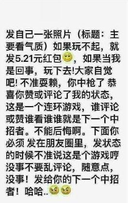 該游戲規則如下:朋友A發出一張自己的照片,標題為“主要看氣質”。如果有朋友點贊或者回復,就是中招。繼續游戲有兩種選擇,要么在朋友圈接著發“主要看氣質”的照片,要么給A發5.21元紅包。