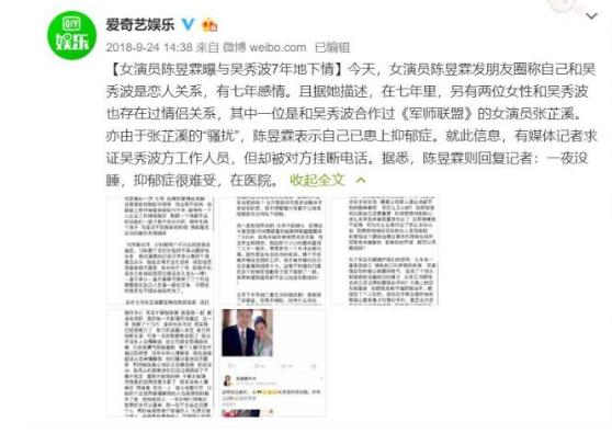 2018年下半年,一位名叫陳昱霖的女藝人爆料,自己與吳秀波有著長達(dá)7年的婚外情,卻慘遭拋棄。她的長文爆料中,提到吳秀波拍攝《軍師聯(lián)盟》期間,她在橫店某酒店跟組陪同333天,每天洗衣熬湯照顧吳秀波。并且點(diǎn)名提及了“小四”、“小五”頻繁騷擾自己。