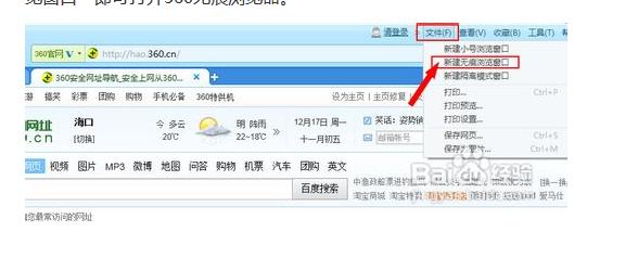 1、打開360安全瀏覽器5.0版,在最上方的標題欄找到“文件”,左鍵單擊選擇“新建無痕瀏覽窗口”即可打開360無痕瀏覽器。彈出的新窗口即無痕瀏覽器,通過這里瀏覽網頁即可使用無痕瀏覽。