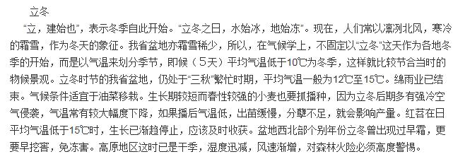 立冬前后,中國大部分地區(qū)降水顯著減少。中國東北地區(qū)大地封凍,農(nóng)林作物進(jìn)入越冬期。中國江淮地區(qū)的“三秋”已接近尾聲,中國江南則需搶種晚茬冬麥,趕緊移栽油菜,中國南部則是種麥的最佳時(shí)期。另外,立冬后空氣一般漸趨干燥,土壤含水較少,中國此時(shí)開始注重林區(qū)的防火工作.