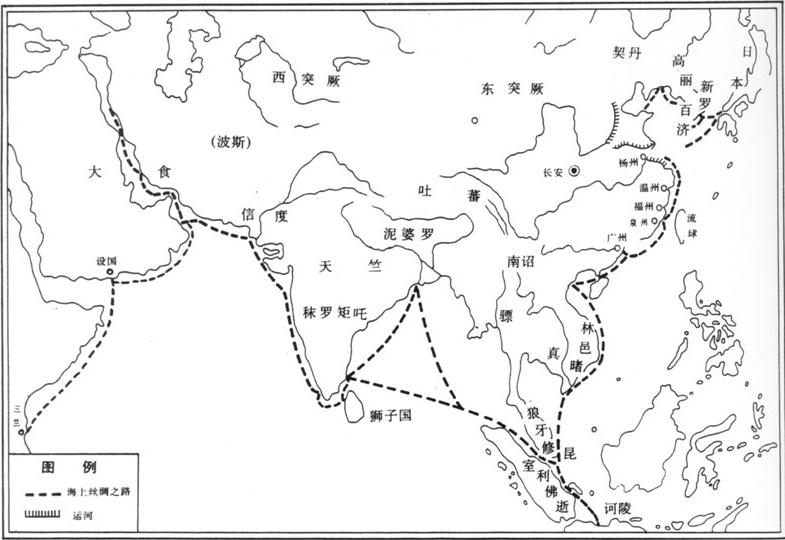 在隋唐以前,海上絲綢之路是陸上絲綢之路的一種補充形式。到隋唐時期,由于西域戰火不斷,陸上絲綢之路被戰爭所阻斷,海上絲綢之路又代之而興起。到唐宋兩代,伴隨著北方少數民族的活躍以及中國造船、航海技術的長足發展,中國通往東南亞、馬六甲海峽、印度洋、紅海,及至非洲大陸航路的紛紛開通與延伸,海上絲綢之路成為中國對外交往的主要通道。