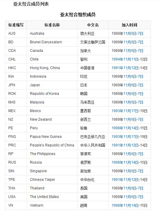 1991年11月,中國以主權國家身份,中華臺北和香港(1997年7月1日起改為“中國香港”)以地區經濟體名義正式加入亞太經合組織。亞太經合組織共有21個成員。