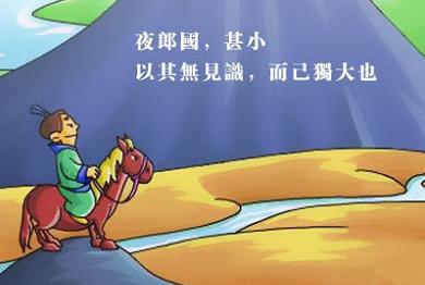典故:漢朝的時候,在西南方有個名叫夜郎的小國家,它雖然是一個獨立的國家,可是國土很小,百姓也少,物產(chǎn)更是少得可憐。但是由于鄰近地區(qū)以夜郎這個國家最大,從沒離開過國家的夜郎國國王就以為自己統(tǒng)治的國家是全天下最大的國家。有一天,夜郎國國王與部下巡視國境的時候,他指著前方問說:“這里哪個國家最大呀?”部下們?yōu)榱擞蠂醯男囊猓谑蔷驼f:“當(dāng)然是夜郎國最大啰!”走著走著,國王又抬起頭來、望著前方的高山問說:“天底下還有比這座山更高的山嗎?”部下們回答說:“天底下沒有比這座山更高的山了。”后來,他們來到河邊,國王又問:“我認(rèn)為這可是世界上最長的河川了。”部下們?nèi)匀划惪谕暬卮鹫f:“大王說得一點都沒錯。”從此以后,無知的國王就更相信夜郎是天底下最大的國家。有一次,漢朝派使者來到夜郎,途中先經(jīng)過夜郎的鄰國滇國,滇王問使者:“漢朝和我的國家比起來哪個大?”使者一聽嚇了一跳,他沒想到這個小國家,竟然無知的自以為能與漢朝相比。卻沒想到后來使者到了夜郎國,驕傲又無知的國王因為不知道自己統(tǒng)治的國家只和漢朝的一個縣差不多大,竟然不知天高地厚也問使者:“漢朝和我的國家哪個大?于是,“夜郎自大”就成了人們譏諷妄自尊大者的典故。